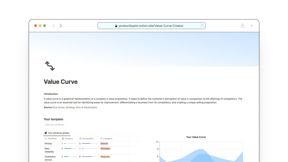 - Value Curve. By defining the value of the key attributes of your product, you know what makes it unique, different, better, strong and/or weak. With this tool, you can see with a graphical representation how you are performing on those key attributes against your competitors. Essential to start building your product.